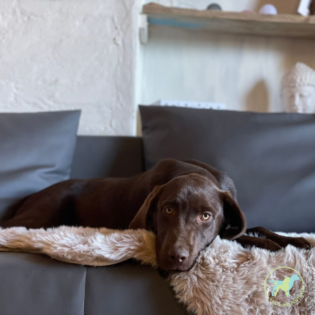 Nala, ist unsere schokobraune Labrador Retriever Hündin aus der Showlinie. Sie ist eine so unkomplizierte und intelligente Hündin. Sie ist nicht die totale Draufgängerin, eher zurückhaltend und in sich ruhend, aber dennoch neugierig. Total gerne tobt sie mit den anderen über den Hof oder begleitet mich beim Joggen, sowie Fahrrad- und Inliner fahren. Nala besitzt ein gutes Vertrauen in ihren Menschen, ihre sie manchmal übermannende Skepsis, kann sie dadurch gut ablegen. So kommt sie auch mit ins Kanu oder auf das Standuppaddling-Board. Nala passt sich Situationen sehr gut an, so kann ich sie ohne Probleme auch von kleinen Kindern (unter Aufsicht) spazieren führen lassen. Sie liebt es im Wald auf Entdeckungstour zu gehen oder auf den abgemähten Feldern Vollgas zu geben. Lieblingsbeschäftigung bleibt aber das Apportieren.